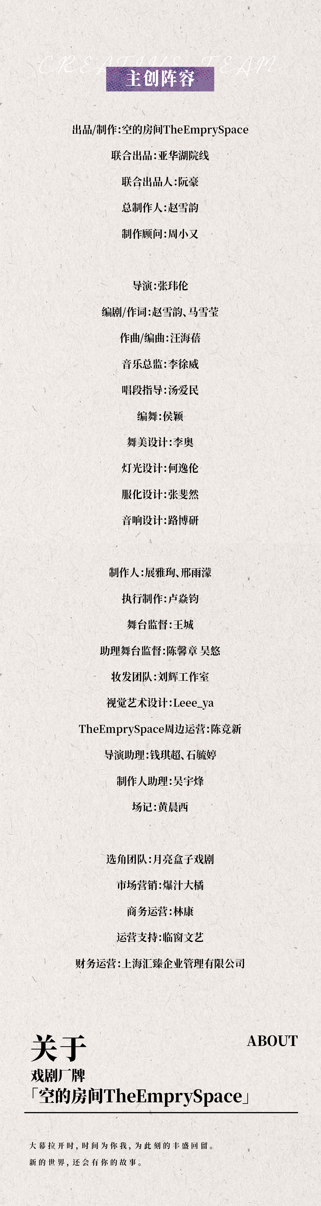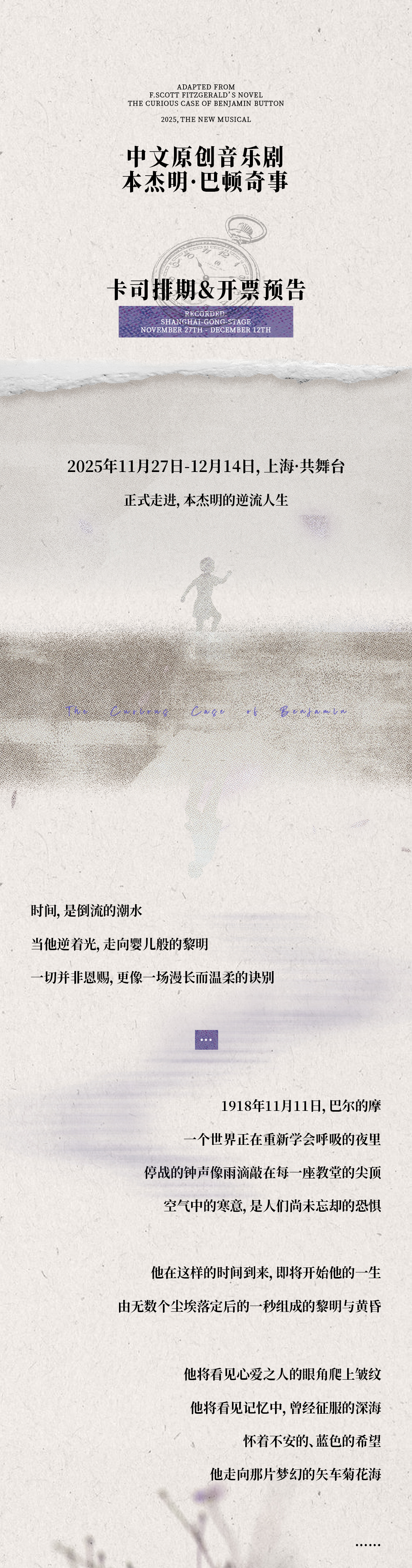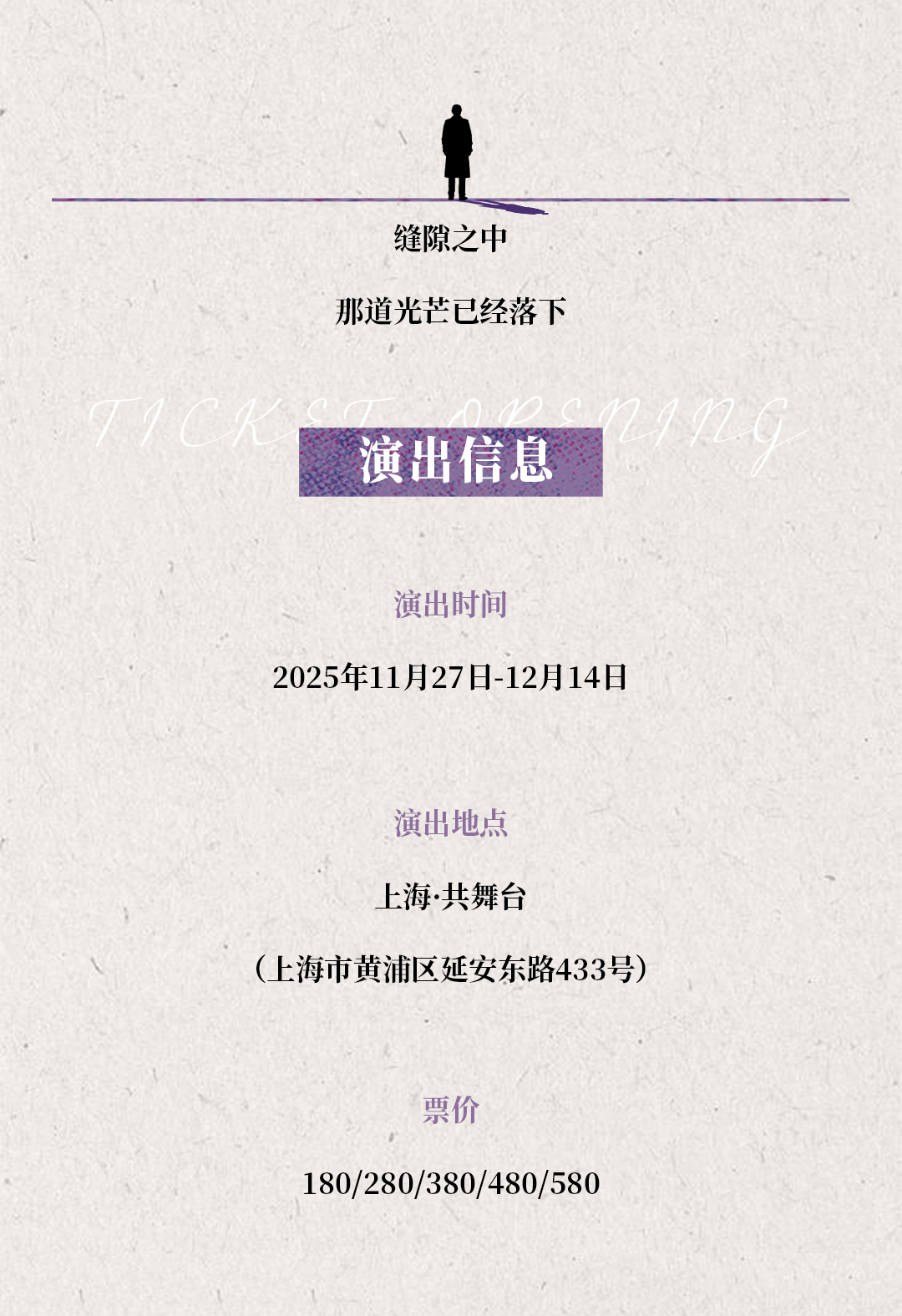 1.凭纸质票入场,因剧情需要,开场前未入场的观众及迟到观众请于幕间工作人员安排下入场(约开场后5分钟),请勿扰乱现场秩序